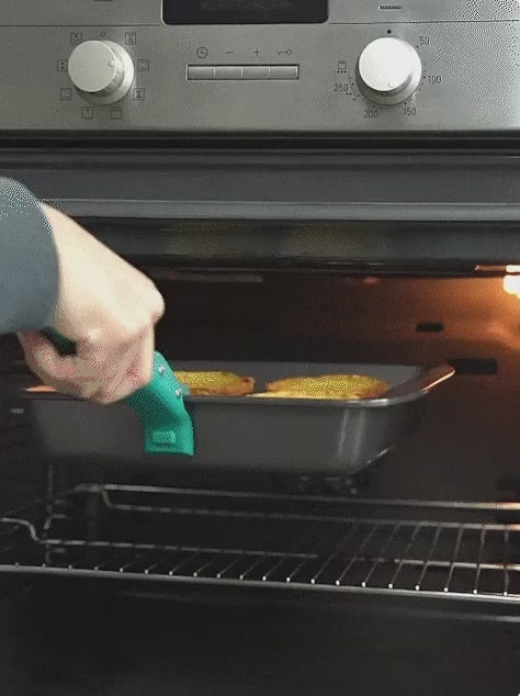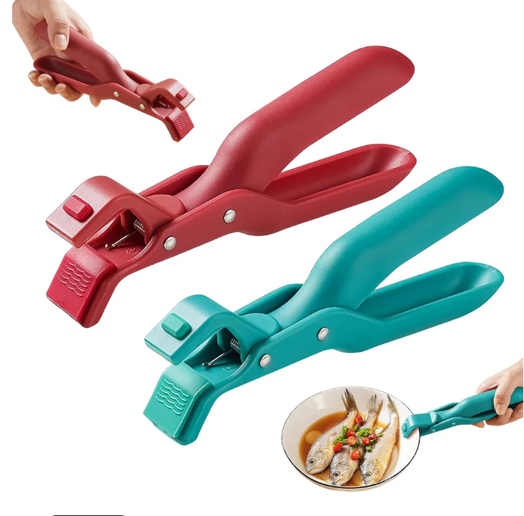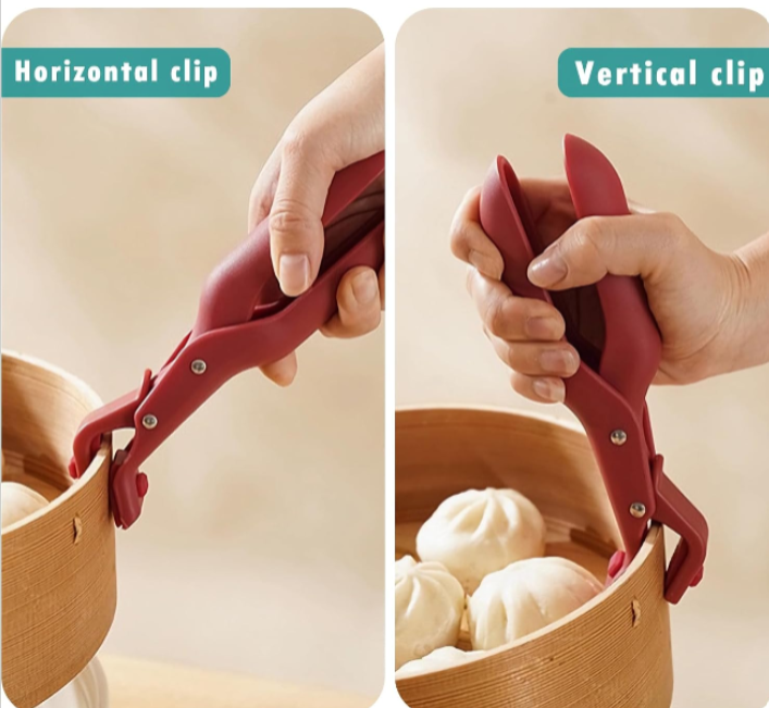 Placez la pince sur le bord du plat chaud, pressez doucement les poignées pour saisir solidement, puis soulevez en toute sécurité. La surface en silicone antidérapante assure une bonne adhérence sans glisser.