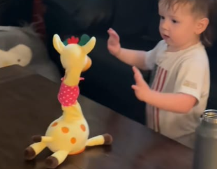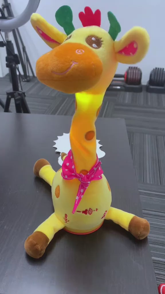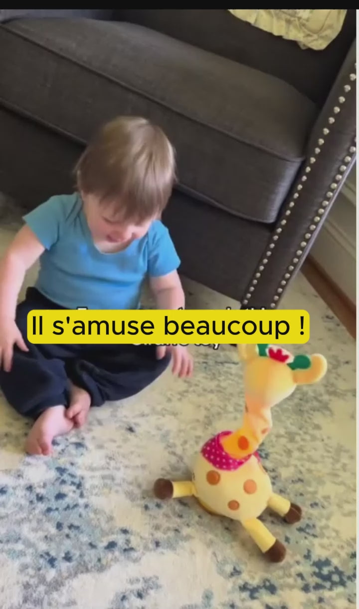 Votre enfant parle, et la girafe répète ce qu’il dit avec une voix amusante. C’est simple, éducatif et hilarant !